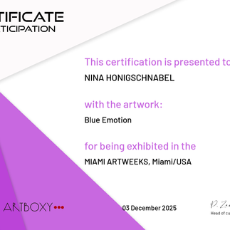 Exhibition MIAMI ARTWEEKS, Miami USA 3rd - 7th December 2025Nina HonigschnabelJan 121 min readExhibition of my Artworks "Grace", "Blue Emotion" and "Lady" at MIAMI ARTWEEKS.